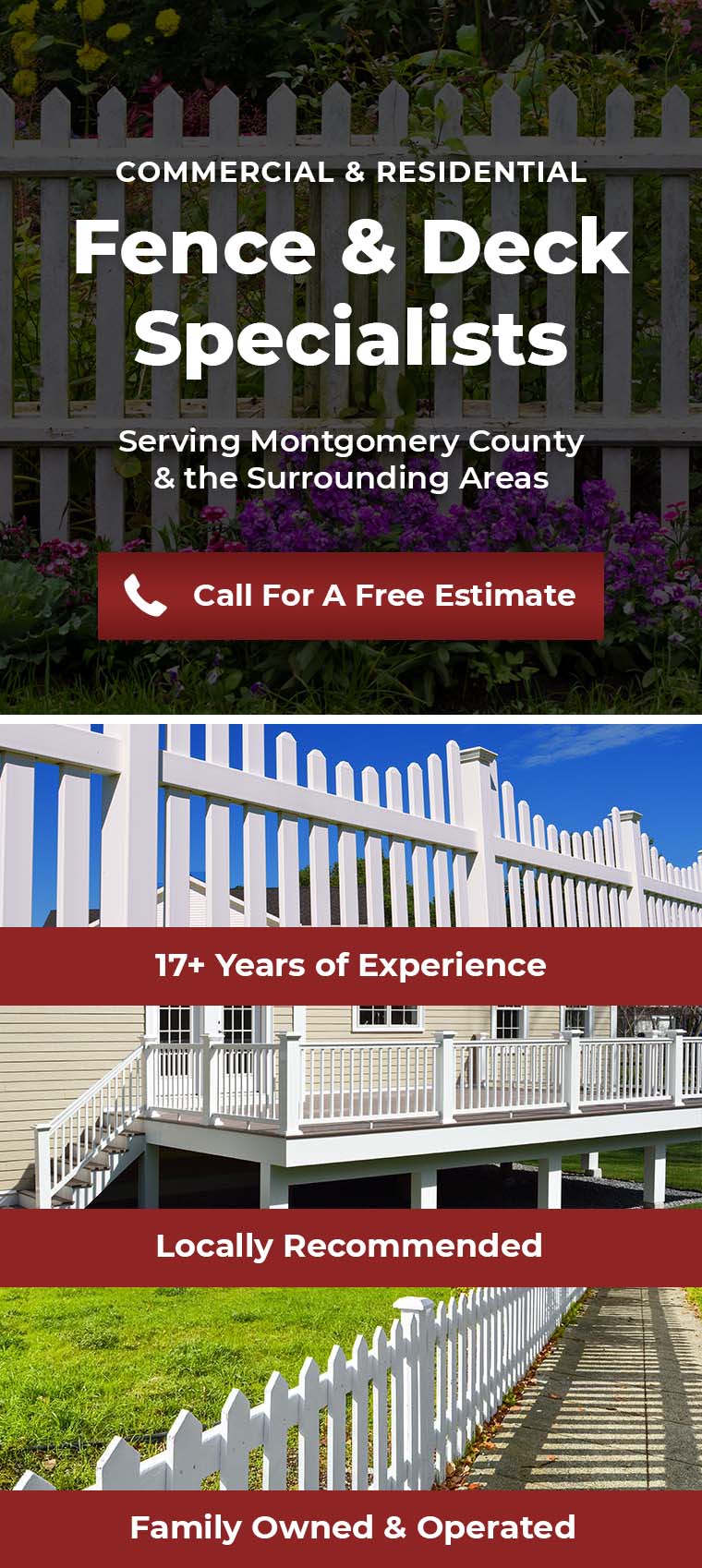 Since 2004, Master Fences has been recognized as one of the leading providers for fence & deck installation & repair in all of Montgomery County and the surrounding areas. Whether you need a brand-new fence or deck, or a simple repair, we will make sure the job is done right the first time. We specialize in all aspects of residential & commercial fencing & deck installations. Our experienced technicians will also help walk you through the process of designing and choosing the best fence or deck for you by asking questions and giving our expert advice that is tailored to fit your needs.